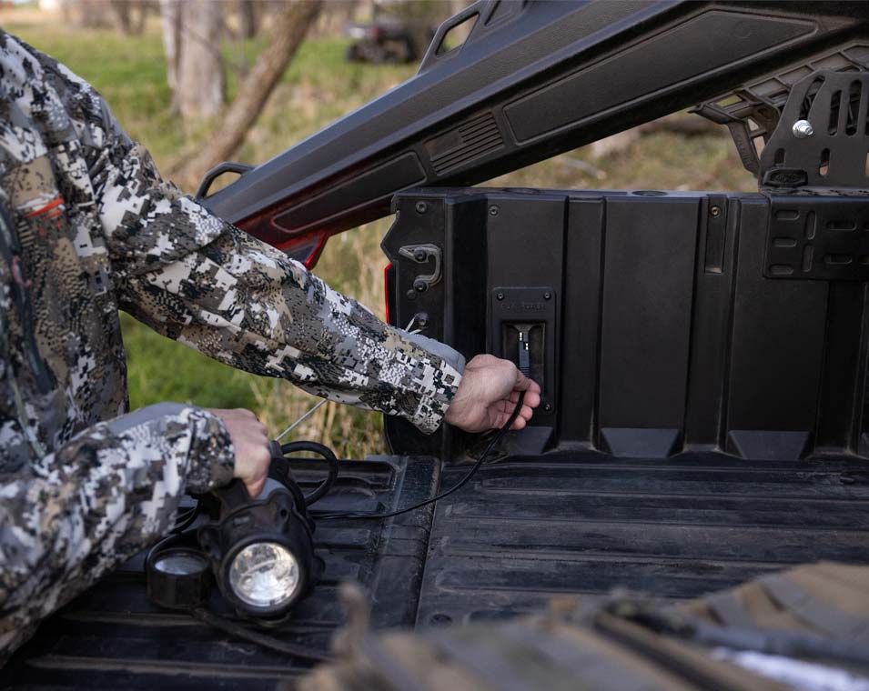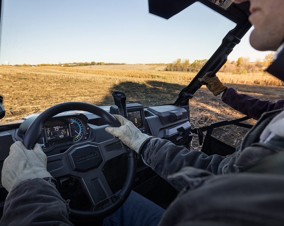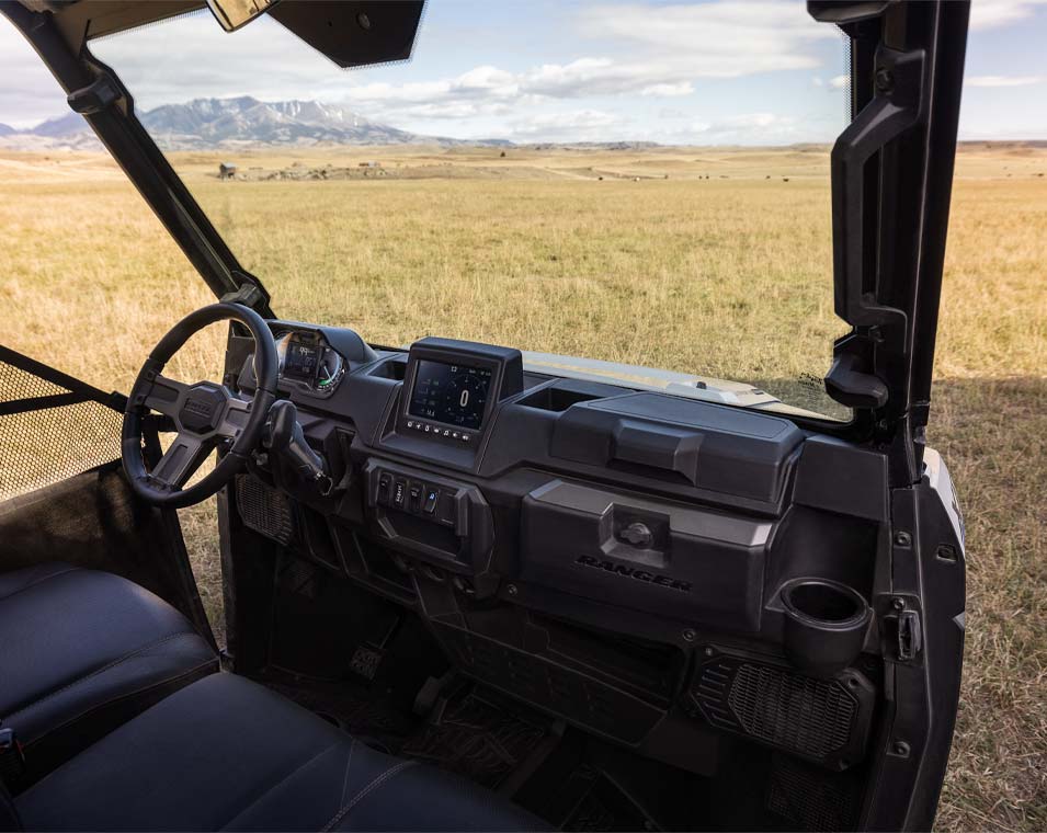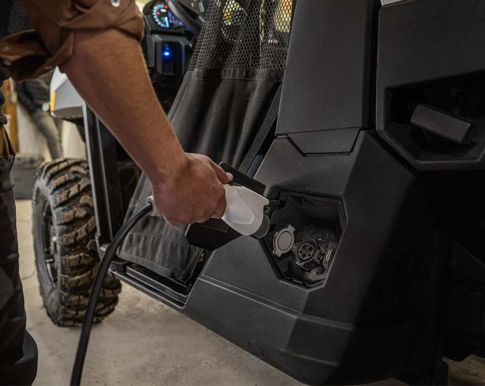 - Zentrales, mit Handschuhen bedienbares 7-Zoll-Touch-Display mit EV-Infotainment (inkl. Restreichweite, Batterieladestand, Ladestatus, Startanzeige, Systemdiagnose und mehr), Geschwindigkeitsbegrenzer, Pflugmodus, *Gruppenfahrt, *GPS-Navigation, Lufttemperatur, Bluetooth, AM/FM-Radio. Doppelte analoge Ziffernblätter auf der Fahrerseite mit 4 Zoll großem Multifarb-LCD-Fahrerinformationszentrum: Stromverbrauch und Energierückgewinnung in %, Batterieladestand in %, verbleibende Reichweite, Ladestrom, Batterietemperatur, Motortemperatur, Spannung Zubehöranschlüsse, Geschwindigkeitsanzeige, Kilometerzähler, Tageskilometerzähler, Ganganzeige, Serviceanzeige und Codes, programmierbare Serviceintervalle, Sicherheitsgurt-Warner, vom Benutzer wählbare Hintergrundbeleuchtung und Helligkeit, Uhr. Premium-Sitze mit konturierten Rückenlehnen und gesticktem Polaris Logo, Premium-Lenkrad und Innenraum-Dekor, Polaris Pulse Electrical System (6 Anschlüsse), Gleichstrom-Steckdosen, Doppelte USB-Anschlüsse, 12V SAE-Anschluss an der Cargo Box mit Ein/Aus-Schalter im Armaturenbrett, Lautsprecher im Armaturenbrett, Rückfahrkamera, *Konnektivität via Ride Command + App